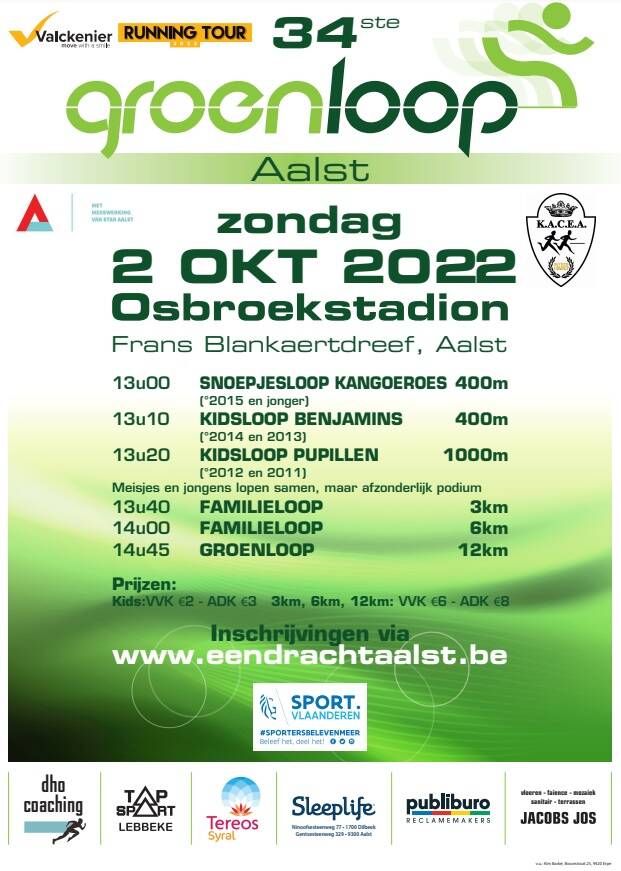 Op zondag 2 oktober 2022 gaat de 34ste editie door van de Groenloop te Aalst. Deze jogging gaat door in het stadspark van Aalst. Er is keuze uit 3km, 6km en 12km, naast de snoepjes- en kidslopen.